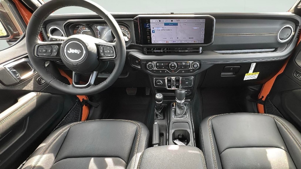 Inside, you'll find premium McKinley-trimmed seats, heated front seats, a heated steering wheel, and 8-way power adjustments for both driver and passenger. A Uconnect 5 system with a 12.3-inch touchscreen offers seamless integration with Apple CarPlay, Android Auto, Alexa Built-In, and SiriusXM 360L. Additional convenience features include remote start, automatic temperature control, a Gorilla Glass windshield, universal garage door opener, and Mopar all-weather floor mats. The High Tide edition also includes exclusive hood and tailgate decals, Willys suspension, and black-painted 17-inch wheels.