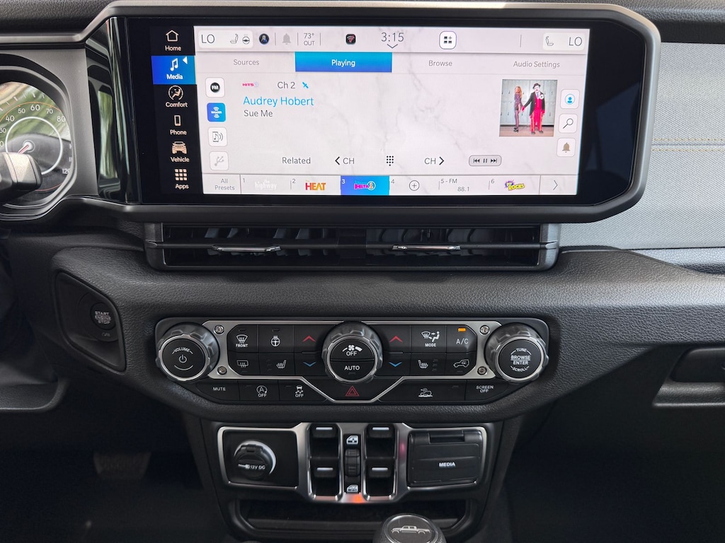 The interior tech is led by the massive 12.3-inch Uconnect 5 touchscreen with Apple CarPlay, Android Auto, SiriusXM 360L, and an 8-speaker audio system. A Mopar spray-in bedliner, Freedom Top 3-piece hard top, trailer wiring, and deep-tint windows complete this highly capable truck.